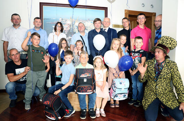 © PALAIKYMAS. Rugsėjo 1-osios išvakarėse pirmąją klasę pradedantys lankyti Klaipėdos jūrų krovinių kompanijos „Bega“ darbuotojų vaikai išlydimi į mokyklą bei apdovanojami įmonės dovanomis.