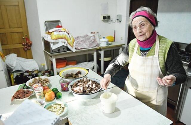 Nuo 5 val. ryto pirmoji į labdaros valgyklą atskubėjusi 81-erių V. Petrauskaitė užkaičia didžiulį, apie 50 l tūrio, katilą ir imasi pjaustyti mėsą bei prieskonines daržoves – svogūnus, česnakus.