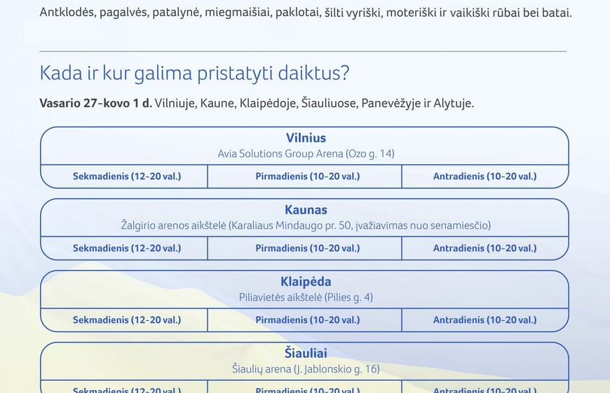„Vakar Lietuvos Raudonasis Kryžius kreipėsi į šalies gyventojus, kviesdamas savanoriauti ir padėti ukrainiečiams, bėgantiems iš karo siaubiamos šalies. Tūkstančiai žmonių atsiliepė ir užsiregistravo, norėdami skirti savo laiko ir taip pagelbėti Ukrainos žmonėms. Šiandien prašome žmonių padėti ukrainiečiams, paaukojant šiltų rūbų, batų, taip pat antklodžių, miegmaišių, paklotų. Tą bus galima padaryti jau sekmadienį“, – sako Lietuvos Raudonojo Kryžiaus draugijos generalinė sekretorė Kristina Meidė.