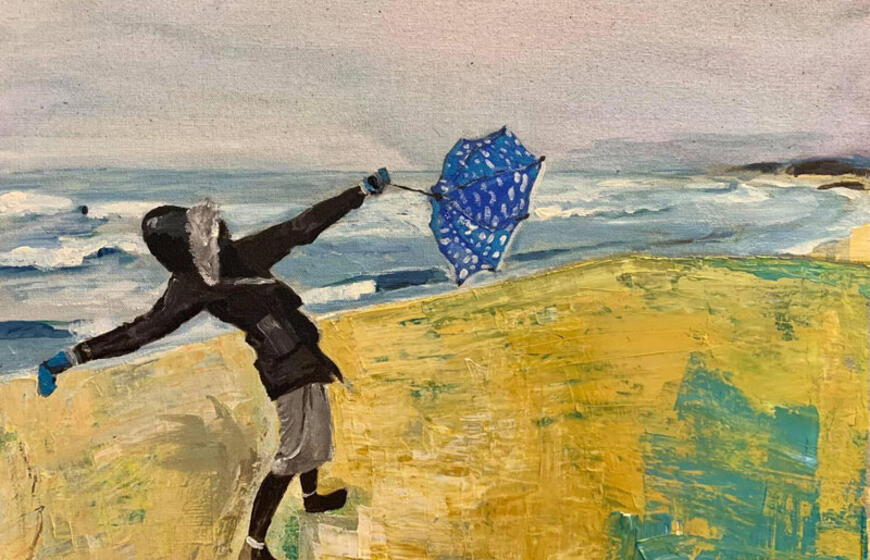 PARDUOTAS. Paveikslas „Vėjuota“ parduotas aukcione pirkėjui iš Klaipėdos. O jo istorija buvo tokia: „Vėjas buvo toks stiprus, kad išlygindavo bangas. Gūsis išlupo katę jai iš rankų. Buvo klaida neštis gyvūną prie jūros. Šaukdama ji atsigręžė. Tai buvo antra klaida.“