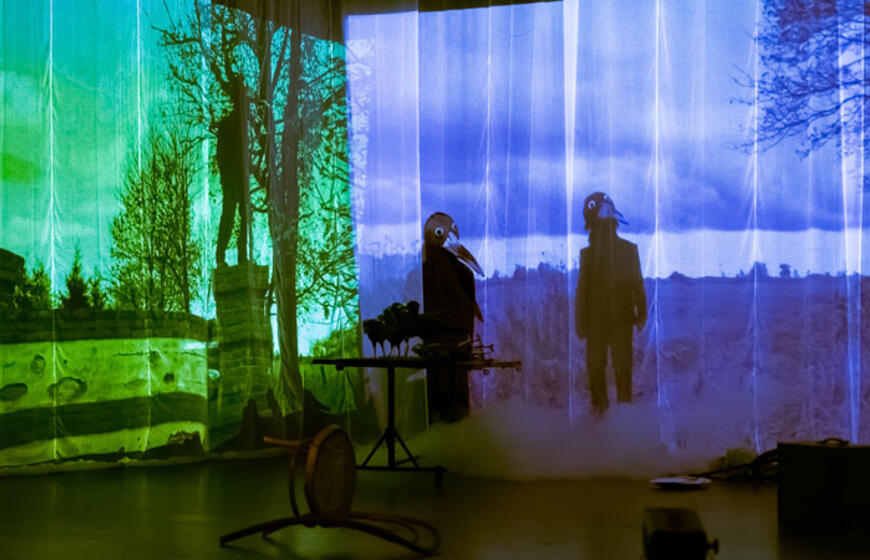 Mes labai daug prifilmavom šitų vaizdų - projekcijos spektaklyje labai svarbios, muzika labai svarbi. Šių dviejų raiškos priemonių sąveika sukuria magišką atmosferą - ir aš pats pasineriu į tuos vandenis, tarp tų paukščių, tų žmonių", - sakė spektaklio režisierius L. Zubė.