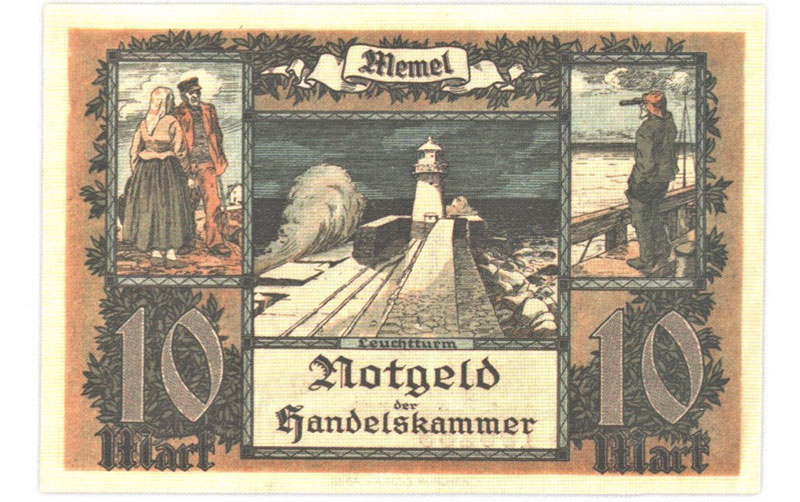 Po Pirmojo pasaulinio karo, 1922 m., Klaipėdos krašto prekybos rūmai išleido laikinuosius vietinius pinigus - notgeldus (markes), kurie pasižymėjo menišku apipavidalinimu panaudojant įvairius to krašto žymiausius jo identitetą akcentuojančius simbolius. 10 markių notgeldų kupiūros centre - ne kas kitas, o Baltasis švyturys.