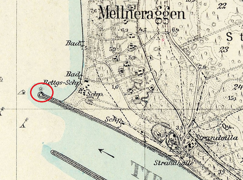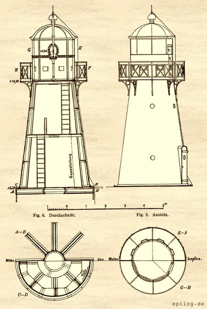 Remiantis senoviniais brėžiniais, arti 9 metrų aukščio navigacinis objektas stūksojo pačiame anuomet 2 150 m ilgio šiaurinio molo gale ant specialiai įrengto mūrytų akmenų postamento. Iki švyturio vedė siaurojo geležinkelio bėgiai, kurių likučiai dar neseniai buvo aptinkami Pirmojoje Melnragėje ir net naudoti prie molo esančių sodybų tvoroms įrengti.