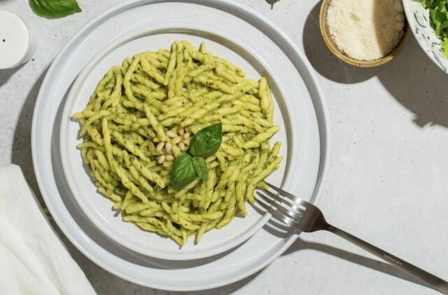 4. Makaronus rekomenduojama patiekti ne tik su pesto padažu, bet ir su keletu baziliko lapelių.