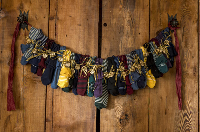 Į kiekvienos kojinės vidų įdėkite po mažą skanėstą, mielą smulkmeną arba ranka rašytą raštelį. Pakabinkite kojinių girliandą matomoje vietoje, kuri taps kasdieniu laukiamu ritualu ir suteiks namams šilumos bei puošnumo.