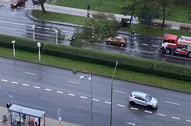 Labai stiprus vėjo gūsis aukštą medį ties Naujuoju turgumi nuvertė tiesiai ant Taikos prospekto važiuojamosios dalies.