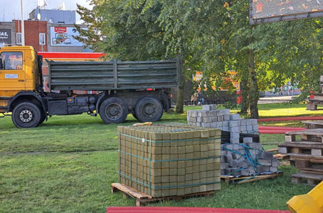 Ant šalia esančios žaliosios vejos ne tik sukrautos statybinės medžiagos, bet ja kuo ramiausiai važinėja bei „trypia“ ir sunkiasvorė technika.