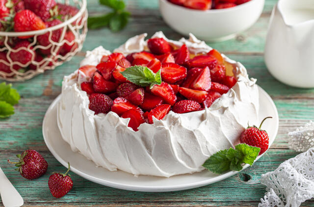Gerai išplakite, kol baltymai bus tvirti – apvertus dubenį jie turi iš jo neiškristi. Kepimo skardą išklokite kepimo popieriumi. Dėkite ant jo baltymų masę ir suformuokite apskritimą, vidurį palikdami šiek tiek įdubusį.