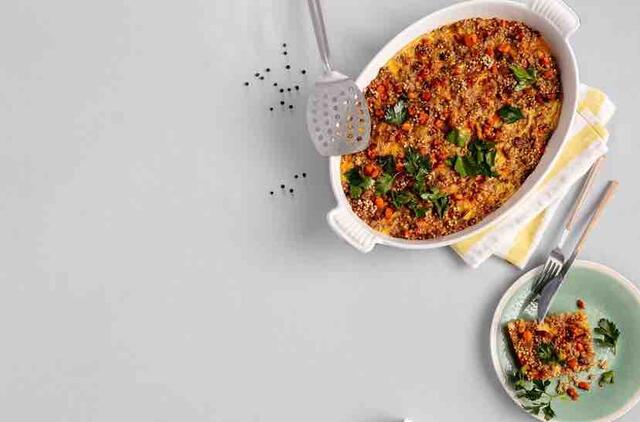 4. Viską sumaišykite su plaktais kiaušiniais ir kepkite orkaitėje apie 30 minučių.