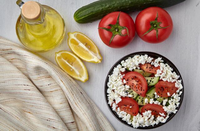 Kulinarijos technologai kviečia atsigaivinti greitomis grūdėtos varškės, pomidorų ir agurkų salotomis.