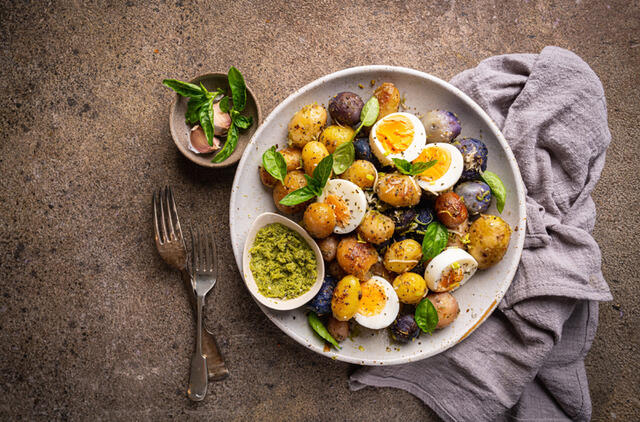 Nors šviežios bulvės yra įprastas garnyras, o vasarą jos ypač mėgstamos su šaltibarščiais, raciono paįvairinimui galima pasigaminti įdomesnio skonio bulvių salotų, pagardintų naminiu pesto padažu.