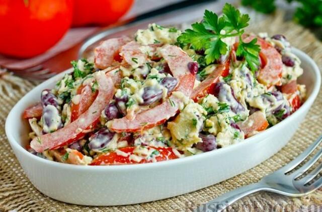 - Paruoštos konservuotų raudonųjų pupelių su pomidorais ir sūriu salotos. Jas galite patiekti iš karto po gaminimo.