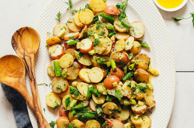 Nupilkite vandenį, perplaukite bulves šaltu vandeniu. Nusausinkite bulves ir sudėkite į didelę lėkštę. Pagardinkite druska, pipirais ir obuolių actu. Atidėkite.