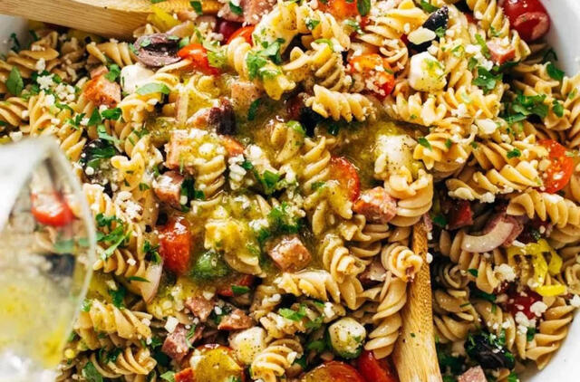 Išvirkite makaronus pagal instrukcijas. Leiskite atvėsti, apšlakstykite aliejumi.
