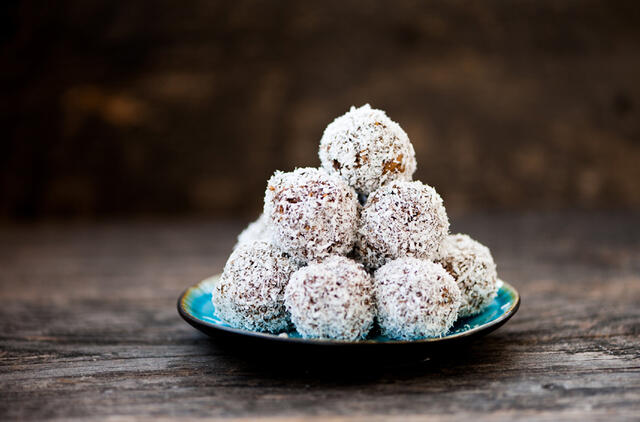 2. Iš mišinio suformuokite golfo kamuoliuko dydžio rutuliukus ir apvoliokite kokosų drožlėse. Palaikykite šaldytuve bent 20 minučių, kad sustingtų.