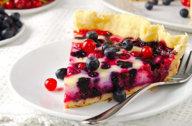 Skanus uogų pyragas su grietinės arba jogurto įdaru