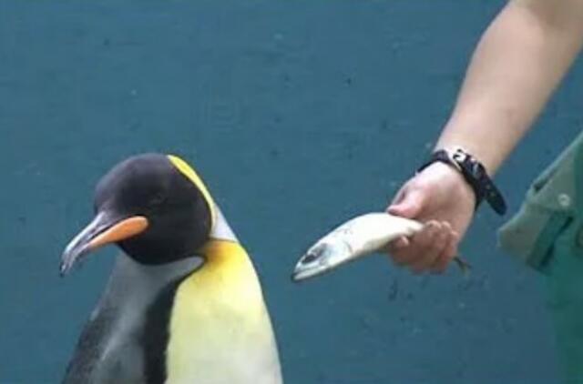 Japonijos Hakonės akvariumo darbuotojas mojuoja skumbre prie pingvino, o šis nusisuka.