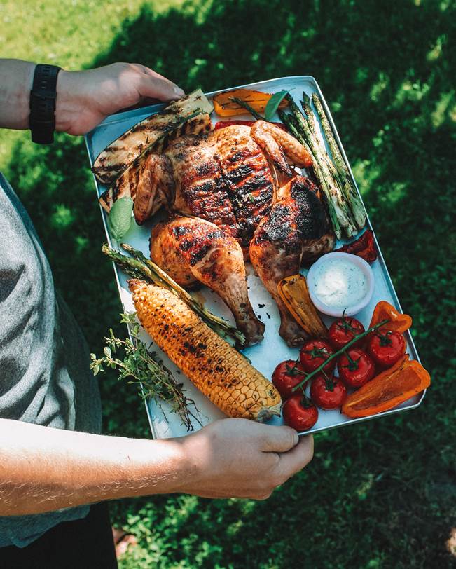 „Angliškai šis metodas vadinasi butterflied chicken – gaminant tokiu būdu pašalinamas viščiuko stuburas, jis kepa plokščias, todėl iškepa greičiau ir tolygiau. O kad būtų dar skaniau ir maistingiau, garnyrui kepėme visą daržovių vaivorykštę: prie viščiuko iškepėme česnakiniu sviestu gardintus kukurūzus, cukiniją, smidrus, paprikas ir pomidorus, o visą skonių derinį tobulai užbaigė česnakinis jogurto padažas“, – pasakoja K. Pišniukaitė-Šimkienė ir dalijasi ypatingai paruoštos vištienos receptu, kuris puikiai tiks ir Joninių stalui.