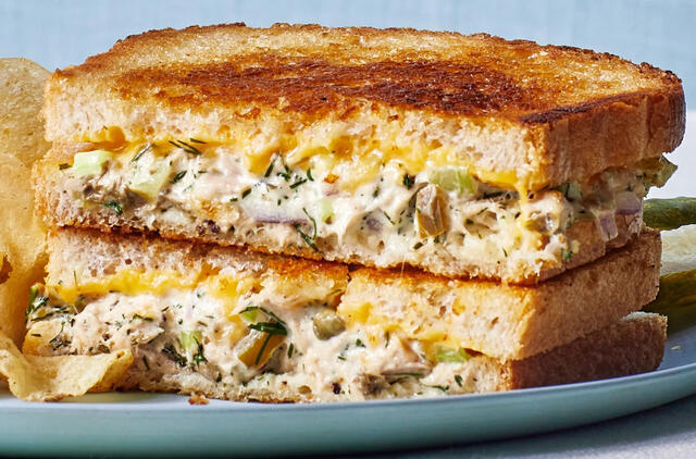 Duonos riekeles aptepkite sviestu, ant 4 riekelių uždėkite sūrio. Išdalinkite tuno mišinį ant 4 duonos riekelių, uždėkite kitas 4 duonos riekeles ant viršaus.