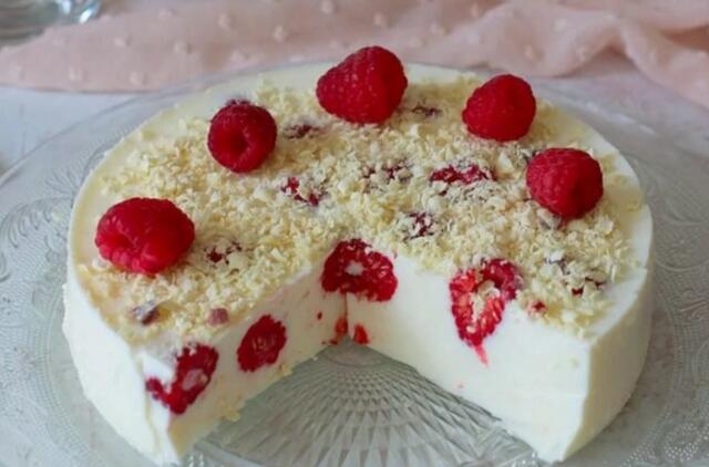 Jis pagamintas iš kefyro, grietinės, želatinos, šviežių aviečių. Ant viršaus užtarkavau baltojo šokolado. Šis nekeptas desertas buvo saikingai saldus. Jautėsi tiek saldumas, tiek truputį kefyro ir grietinės rūgštumo.