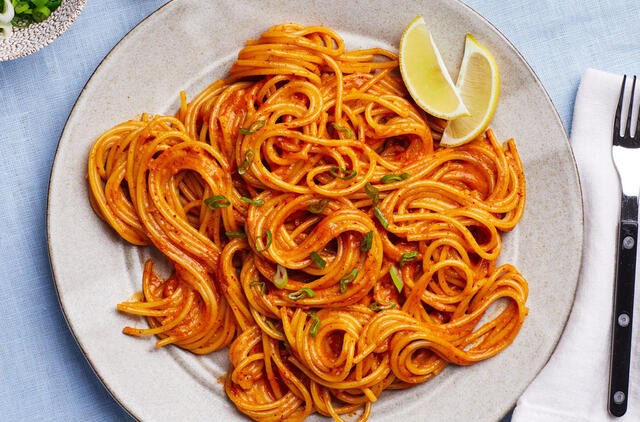 Padalykite makaronus į negilius dubenėlius. Ant viršaus uždėkite plonais griežinėliais pjaustytų svogūnų laiškų. Patiekite su citrinos skiltelėmis.
