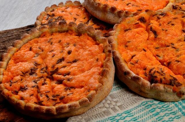 Reikės: stiklinės rupių ruginių miltų, 100 g sviesto, 250 g bulvių, 400 g morkų, 100 ml grietinėlės, 3 šaukštų grietinės, 2 kiaušinių, šiek tiek cukraus arba medaus, druskos, kmynų.