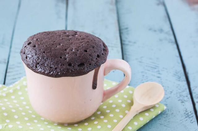 Reikės: 2 šaukštų miltų, 1 šaukšto nesaldintos kakavos miltelių, 2 šaukštelių cukraus, ¼ šaukštelio kepimo miltelių, žiupsnelis druskos, 1 šaukšto aliejaus, 2 šaukštų pieno, 1 šaukšto riešutų kremo.