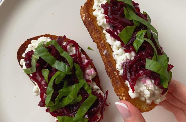 - Aptepkite duonos riekeles varške, uždėkite burokėlių. Galite pagardinti šviežiu baziliku.
