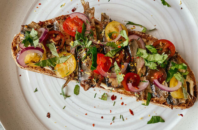 Ant duonos tepame majonezą, dedame šprotus, pomidorus, svogūnus – viską papuošiame žalumynais ir apibarstome citrinos žievele ir aitriosios paprikos dribsniais. Skanaus!