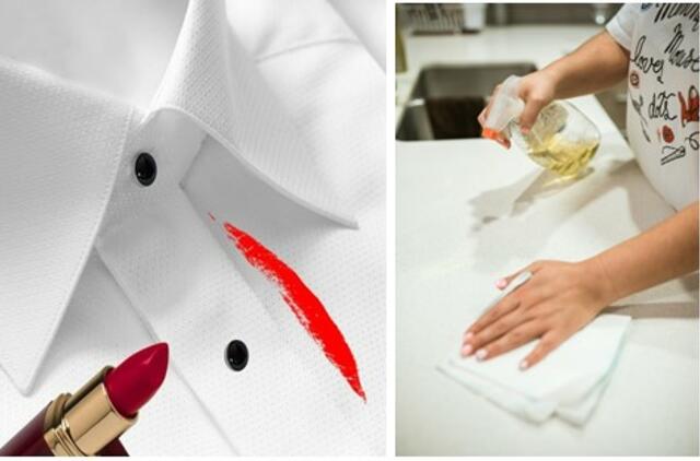 Lūpdažio dėmei pašalinti naudokite plaukų laką. Užtepkite jį ir palikite kelioms minutėms.