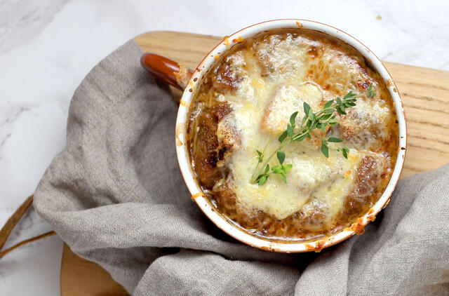 Galiausiai sriubą supilkite į kepimui orkaitėje skirtus indelius, ant viršaus uždėkite skrebutį ir užberkite sūrio.