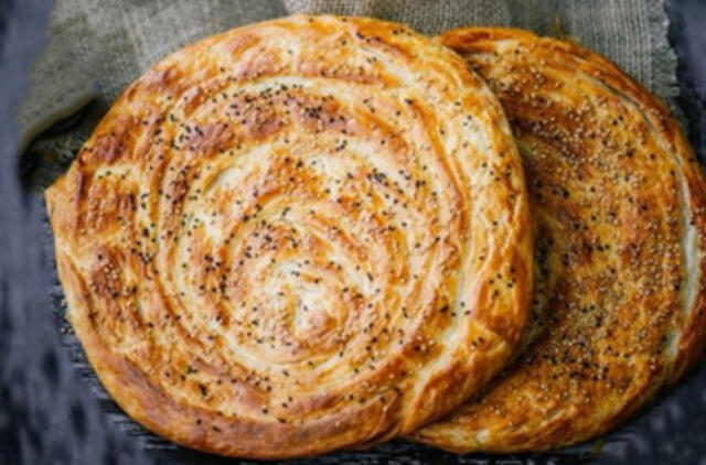 - 2. Paviršių sutepti aliejumi, kiekvieną kamuoliuką ištempti rankomis maksimaliai plonai, galima iškočioti kočėlu.