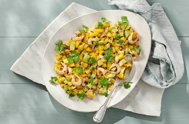 2. Sumaišykite mangą, avokadą, aitriąją papriką, česnaką, krevetes, aliejų ir žaliųjų citrinų sultis. Pagardinkite druska ir pipirais.