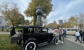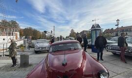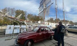 Klaipėdiečiai su šeimomis grožisi senovinių automobilių ekspozicija ir prie jų noriai fotografuojasi.
