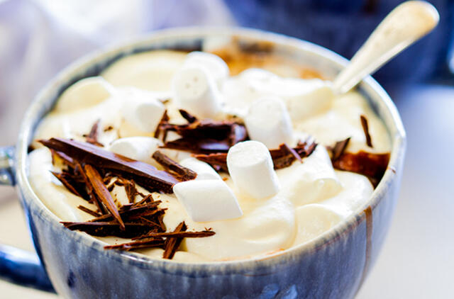 Supilkite karštą šokoladą į aukštas stiklines ir patiekite su plakta grietinėle, zefyriukais ir šokolado drožlėmis.
