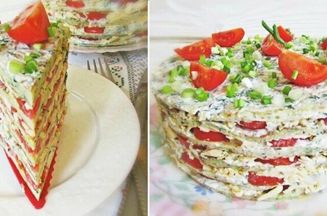 Surinkite tortą. Tam blyną sutepkite grietine, jogurtu ar majonezu, dėkite ant jo truputį morkų su česnaku ir svogūnu. Pakaks dviejų valgomųjų šaukštų tokio įdaro.