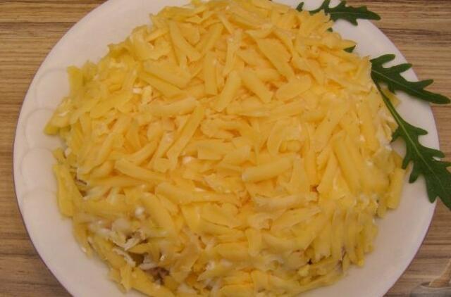 Šiose salotose kiekvieną sluoksnį reikia lengvai paspausti ir patepti majonezu (išskyrus sūrio sluoksnį).