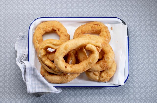 Spurgas kepti karštame aliejuje, bet ne verdančiame. Kepti maždaug po 2 min kiekvieną pusę, kol įgaus auksinę spalvą.