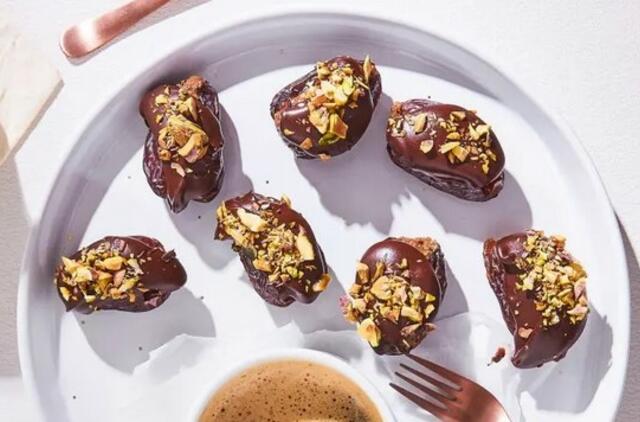 Šokoladą ištirpinkite karšto vandens vonelėje, su sviestu arba aliejumi ir supilkite ant datulių.