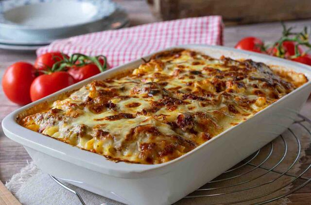 Makaronų apkepas su daržovėmis, mėsa ir sūriu*