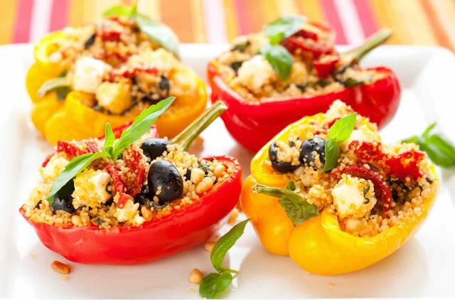 Romantiškai vakarienei pasigaminkite Viduržemio virtuvės įkvėptą patiekalą – kuskusu, feta ir džiovintais pomidorais įdarytas paprikas.