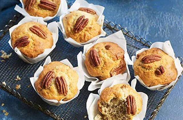 Išmaišykite sausus ir šlapius ingredientus šakute. Stenkitės nepermaišyti. Įmaišykite skaldytus riešutus.