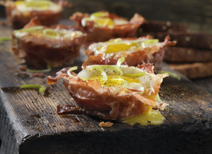 Kiekvieną keksiukų kepimo indo dalį išklokite kumpiu, ant viršaus berkite tarkuotą sūrį ir įmuškite po vieną kiaušinį. Pagardinkite druska ir pipirais.