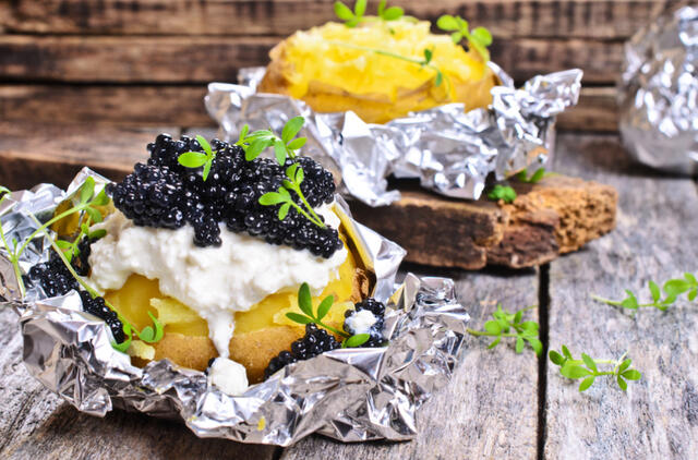 Kepti bulvių laiveliai su ciegorių ikrais ir rūkyta lašiša