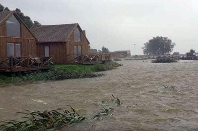 Vaizdai miestelyje kaip po cunamio – apsemtos gatvės, turistiniai nameliai plaukia vandenyje, išvartyti suoliukai.