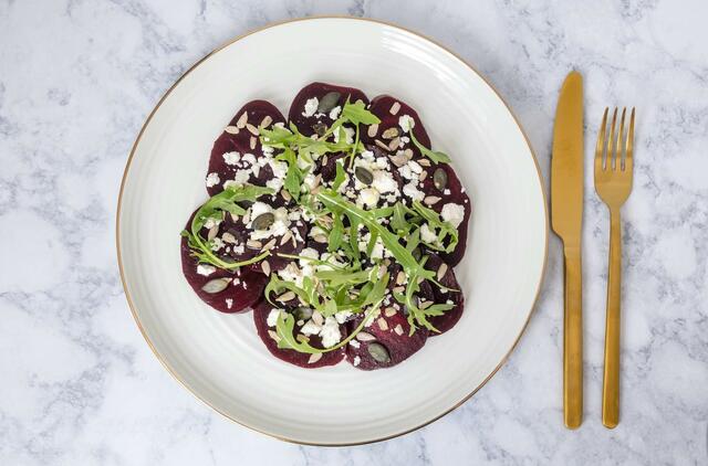 Burokėlių karpačas su ožkos sūriu ir avietėmis