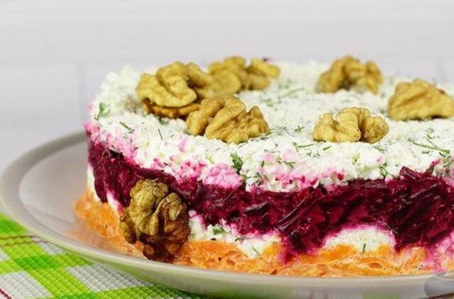 - Ant varškės sluoksnio sudėkite burokėlių mišinį. Išlyginkite šaukštu ir šiek tiek sutrinkite.