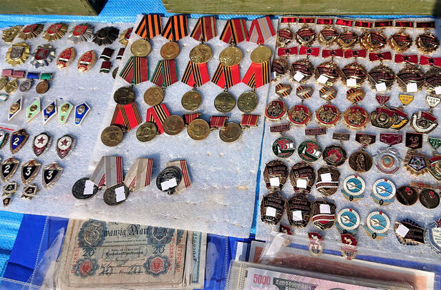 Sovietų Sąjungos laikų atributikos Tilžės turgaus sendaikčių aikštėje - nors vežimu vežk. Ir vėl: yra ir brangiai kainuojančių originalų, ir pigesnių jų kopijų.