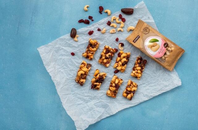Anakardžių batonėliai su datulėmis ir spanguolėmis