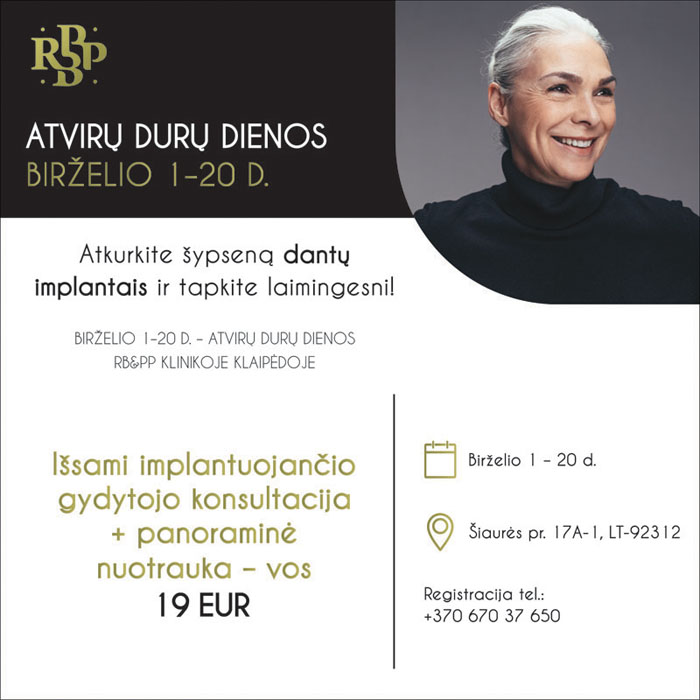„Pasitelkiant mažus varžtelius, pakeičiančius dantų šaknis, ant jų galima sukurti tobulai atrodančius ir funkcionuojančius dantų protezus. Ant implantų protezuoti dantys beveik nesiskiria nuo tikrų. Šis metodas greitai išsprendžia sveikatos problemas, sugrąžina patrauklią išvaizdą, pasitikėjimą savimi ir vėl leidžia džiaugtis visaverčiu gyvenimu. Priklausomai nuo paciento klinikinės situacijos ir finansinių galimybių, siekdami užtikrinti nepriekaištingą kramtymo funkciją ir natūralų pojūtį, siūlome skirtingus dantų atkūrimo variantus: sriegiame vieną, du, keturis ar daugiau implantų. Pasaulyje pripažintų gamintojų implantai sukurti taip, kad atliekant procedūrą būtų taikomas minimaliai invazyvus gydymas, nesukeliantis pacientui jokių nemalonių pojūčių“, - pasakoja dantų atkūrimo specialistas.